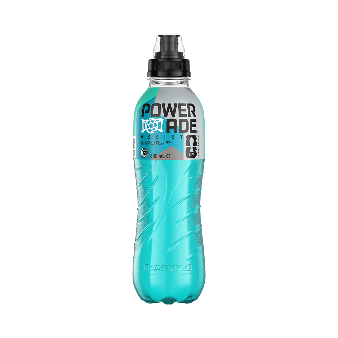 Powerade Assist is a citrus hibiscus formulated beverage with electrolytes and contains vitamin B5 to help reduce tiredness and fatigue.