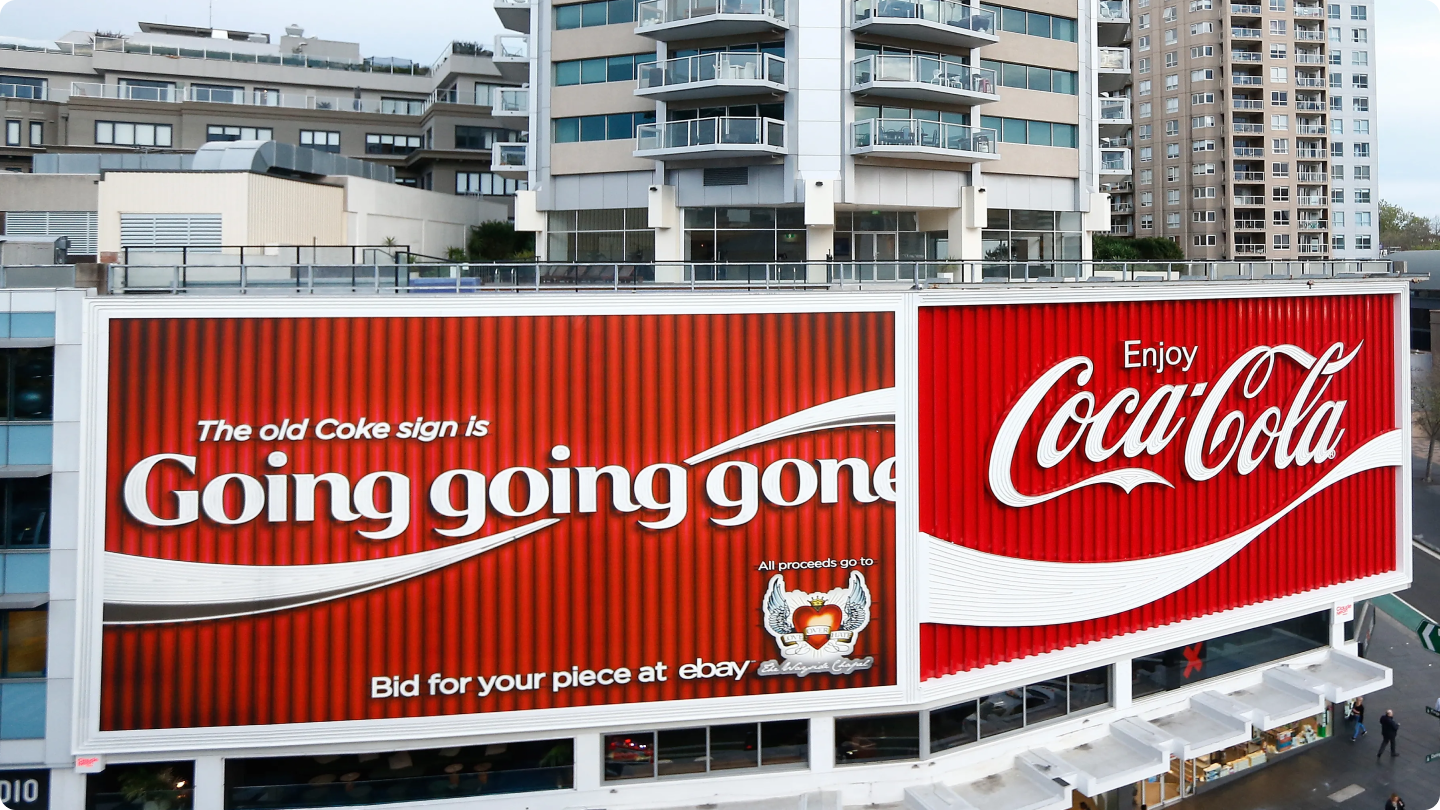 Coca‑Cola used this moment, to give back to the local community while keeping the old sign alive. Each letter of the classic Coca‑Cola script sign was auctioned off to the public, raising $100,700 for local charity Wayside Chapel.