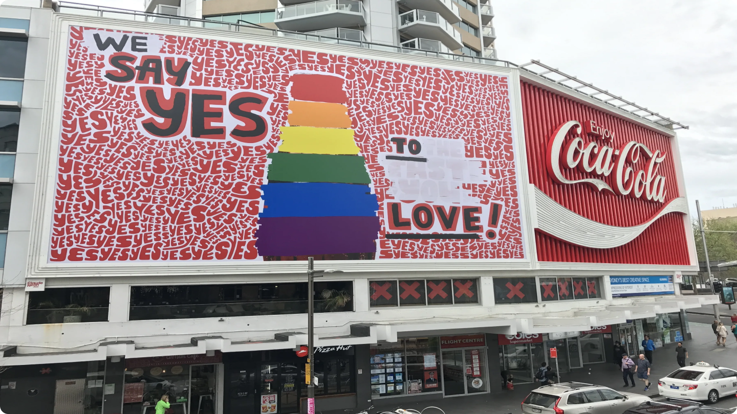 In 2017, as Australia made history with the marriage equality postal vote, Coca‑Cola proudly stood behind the movement, releasing limited-edition 'Love' cans and lighting up its iconic Kings Cross sign with the message 'Say Yes to Love.'
