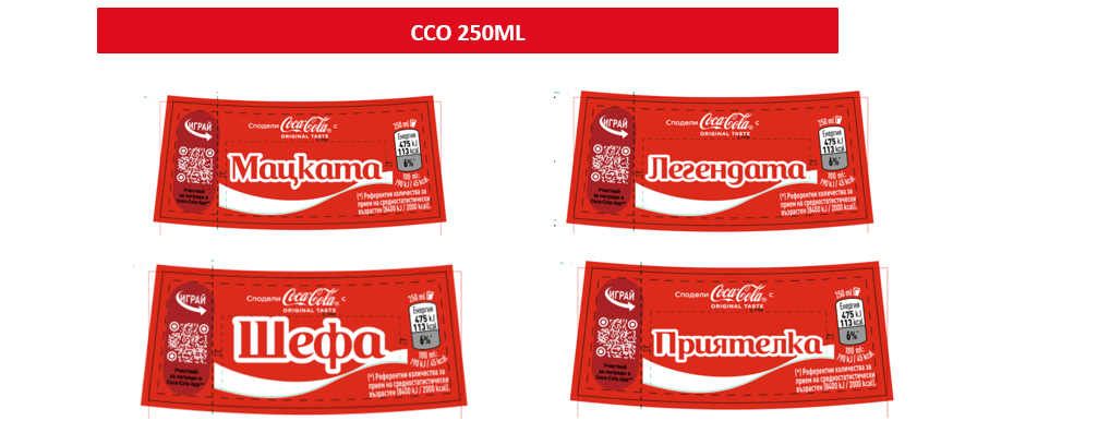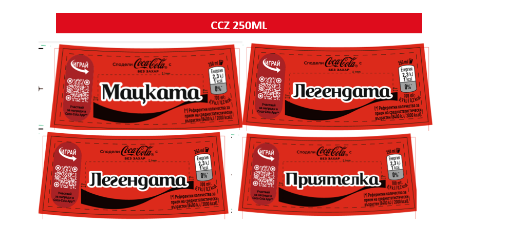 250ml- Coca‑Cola, Coca‑Cola Без Захар, 330ml- Coca‑Cola, Coca‑Cola Без Захар, 500ml- Coca‑Cola, Coca‑Cola Без Захар, Coca‑Cola Череша, Coca‑Cola Череша Без Захар, Coca‑Cola Лимон Без Захар, 1L- Coca‑Cola, Coca‑Cola Без Захар,1.5L- Coca‑Cola, Coca‑Cola Без Захар,2L-Coca‑Cola, Coca‑Cola Без Захар