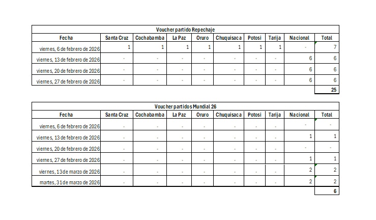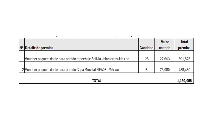 Se ha definido una distribución de los premios para la presente promoción que serán asignados en los sorteos para los Vouchers paquetes dobles para los partidos del repechaje Bolivia - Monterrey - México y La Copa Mundial de la FIFA 26™ – México mismos que se realizarán en las siguientes fechas: