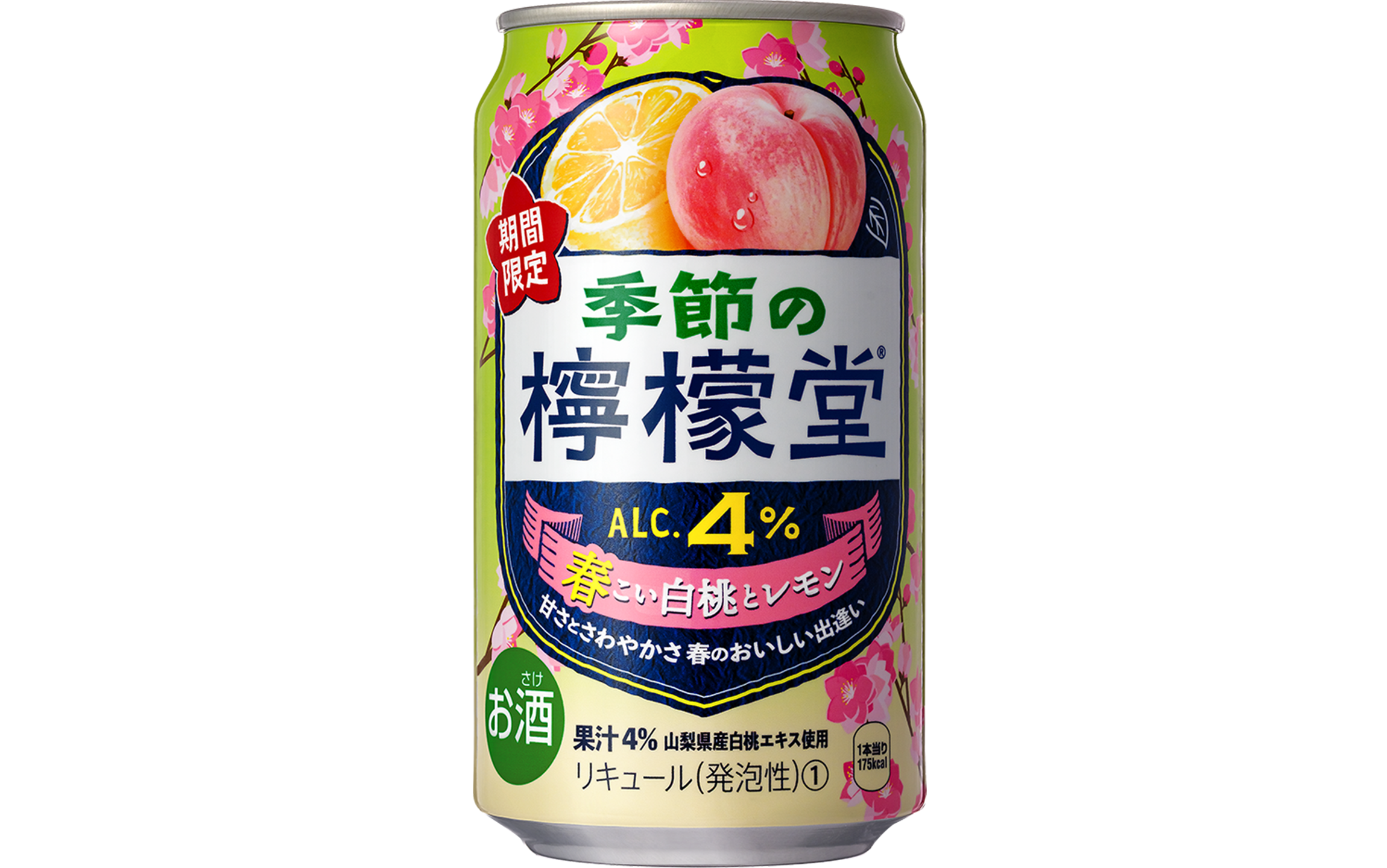 2026年の第一弾は「季節の檸檬堂 春こい白桃とレモン」です。2025年にも大好評いただきました、春の訪れが待ち遠しくなるような春限定のフレーバーです。本製品には特別に開発した「山梨県産白桃エキス」を使用しています。春を感じさせる白桃の華やかな香りとほのかな甘さの後に、レモンのさわやかな酸味がすっきりと引き立つ絶妙なバランスに仕上げました。白桃とレモンサワーのおいしい出逢いをお楽しみください。
