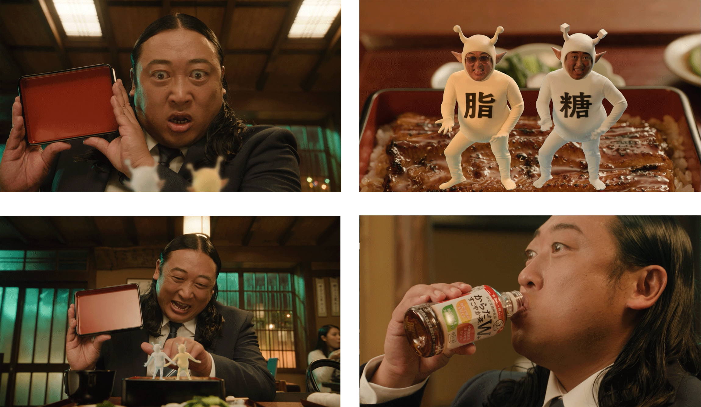 仕事帰りに馴染みの鰻屋を訪れたサラリーマン秋山さん。ワクワクしながらうな重の蓋を開けると、目の前に2体の小悪魔が出現します。かわいらしい赤ちゃん声でまとわりついたり、ダンスをしたりとお茶目に存在をアピールしてくる小悪魔たち。最初は困惑する秋山さんも次第にデレデレに。小悪魔2体にすっかり魅了されていく様子が描かれています。「からだすこやか茶W+」を手に、秋山さんご本人曰く「人類で一番美味しそうな顔」でうな重を頬張る秋山さんのグルメ愛全開の表情にも注目です。