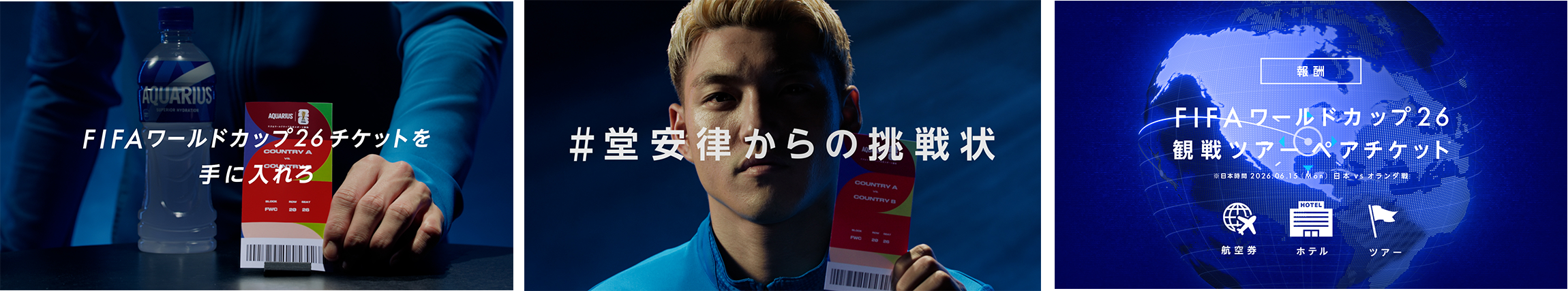 コカ・コーラシステムの「アクエリアス」は、 FIFA ワールドカップ26の公式スポーツ飲料として、FIFA ワールドカップ26観戦ツアーが当たるキャンペーンを2月17日(火)より始動いたします。本キャンペーンではサッカー日本代表・堂安律選手がアンバサダーとなり、アクエリアス公式X上で展開される「#堂安律からの挑戦状」と題したミッションをクリアした方の中から5組10名様をFIFAワールドカップ26観戦チケット付きツアーにご招待します。これに併せて、堂安選手が登場する動画を公開し、2月21日(土)・22日(日)に渋谷道玄坂広場でキャンペーンを盛り上げるリアルイベントを開催します。また、期間限定の「アクエリアス」FIFAワールドカップ26デザインボトルの展開に合わせ、総計20万名様にその場で豪華賞品が当たるキャンペーンを全国で実施する等、同大会を盛り上げる様々な施策を実施します。