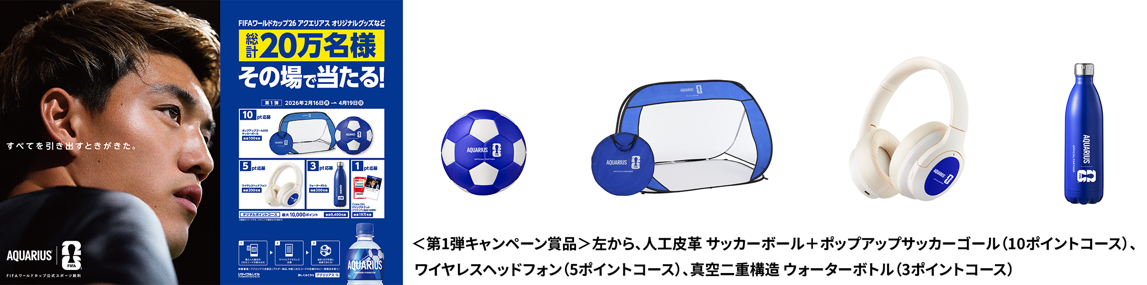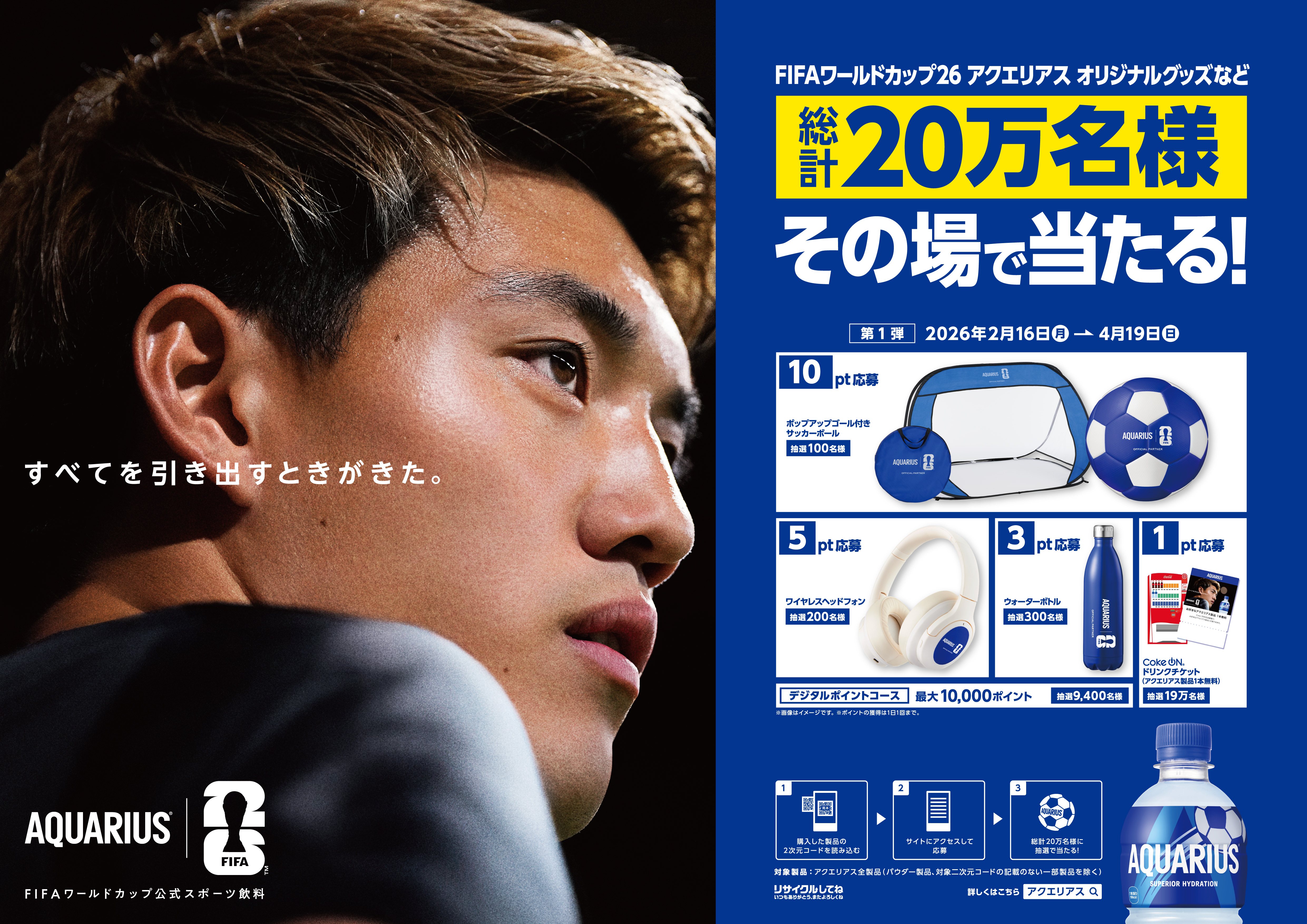 これに伴い、FIFAワールドカップ26アクエリアス オリジナルグッズなどをプレゼントするキャンペーンを実施します。対象製品のラベルの二次元コードをスマートフォンで読み込むと、貯めた抽選ポイント数に応じて抽選で総計20万名様(第1弾)にサッカー用品などのオリジナルグッズやデジタルポイントがその場で当たります。