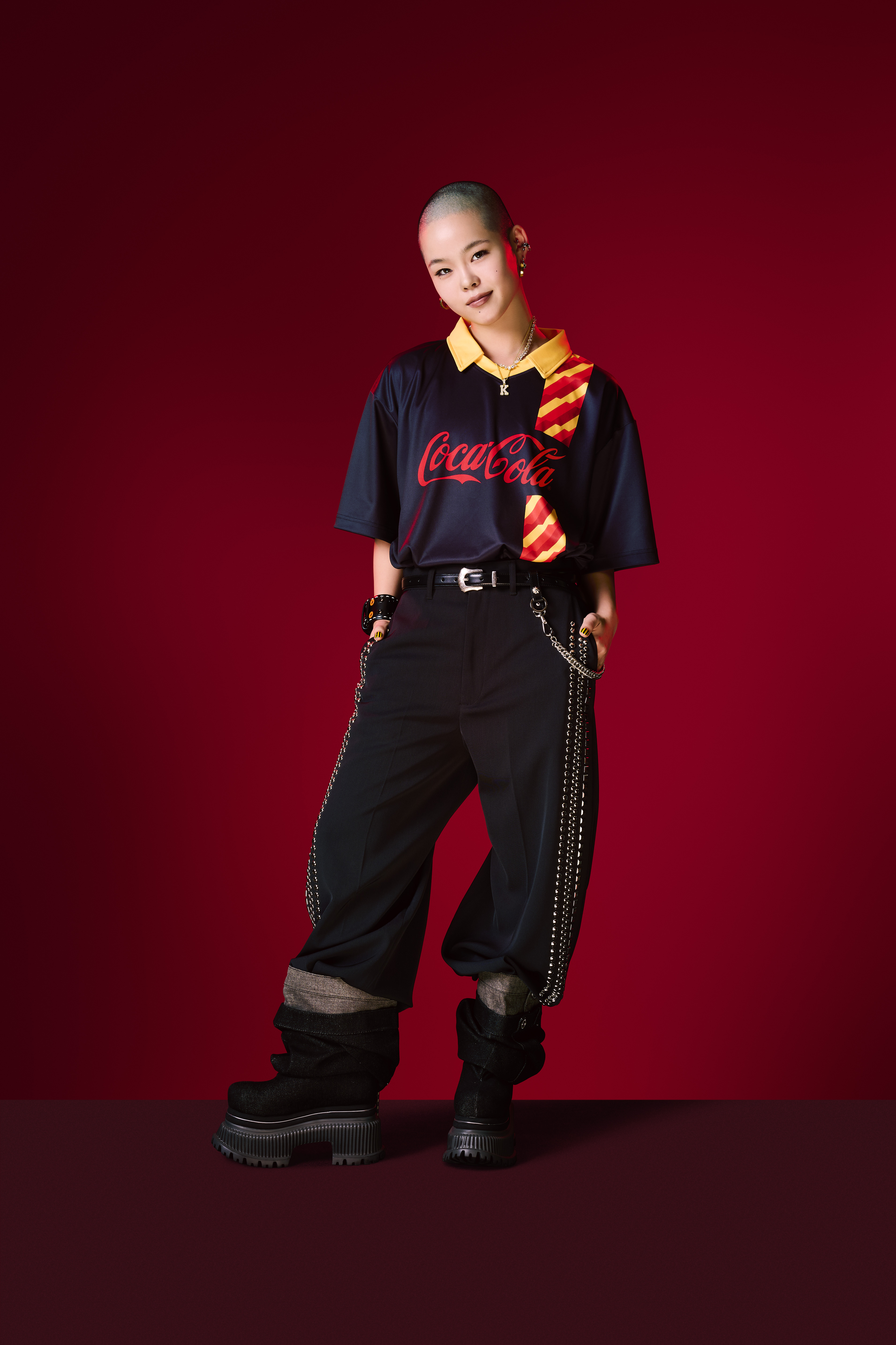 オーバーサイズのユニフォームをミニマルに着こなしつつ、デザインが入ったデニムに中に着ているレギンス、チェーンのアクセサリーの組み合わせがお気に入りです。