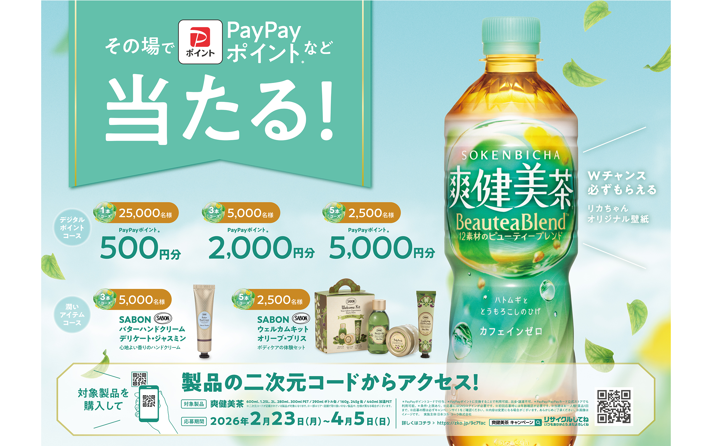 二次元コードから応募でPayPayポイント、またはSABONのハンドクリームやウェルカムキットがその場で当たる!リカちゃんオリジナル壁紙はWチャンスで必ずもらえる