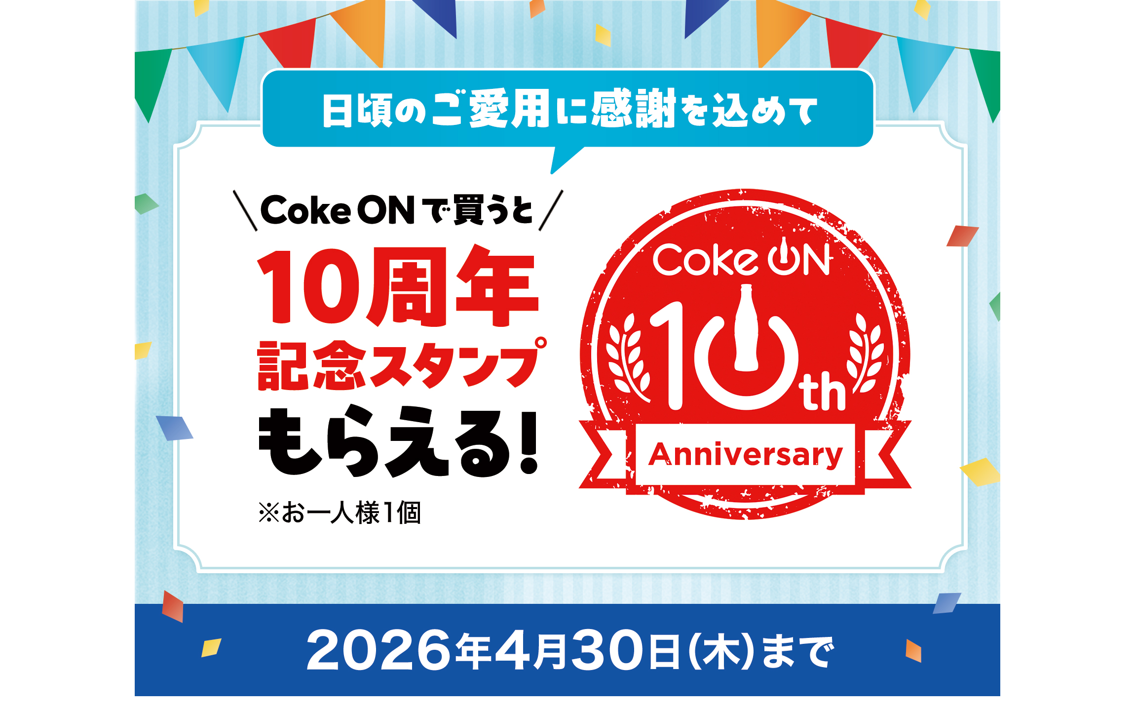 さらに、2026年5月から12月までの期間中、毎月10日を「Coke ON」の日として、「Coke ON」アプリで購入いただいた方を対象に、10周年限定スタンプが各月1つ、期間中最大8つもらえるキャンペーンも12月まで実施予定です。