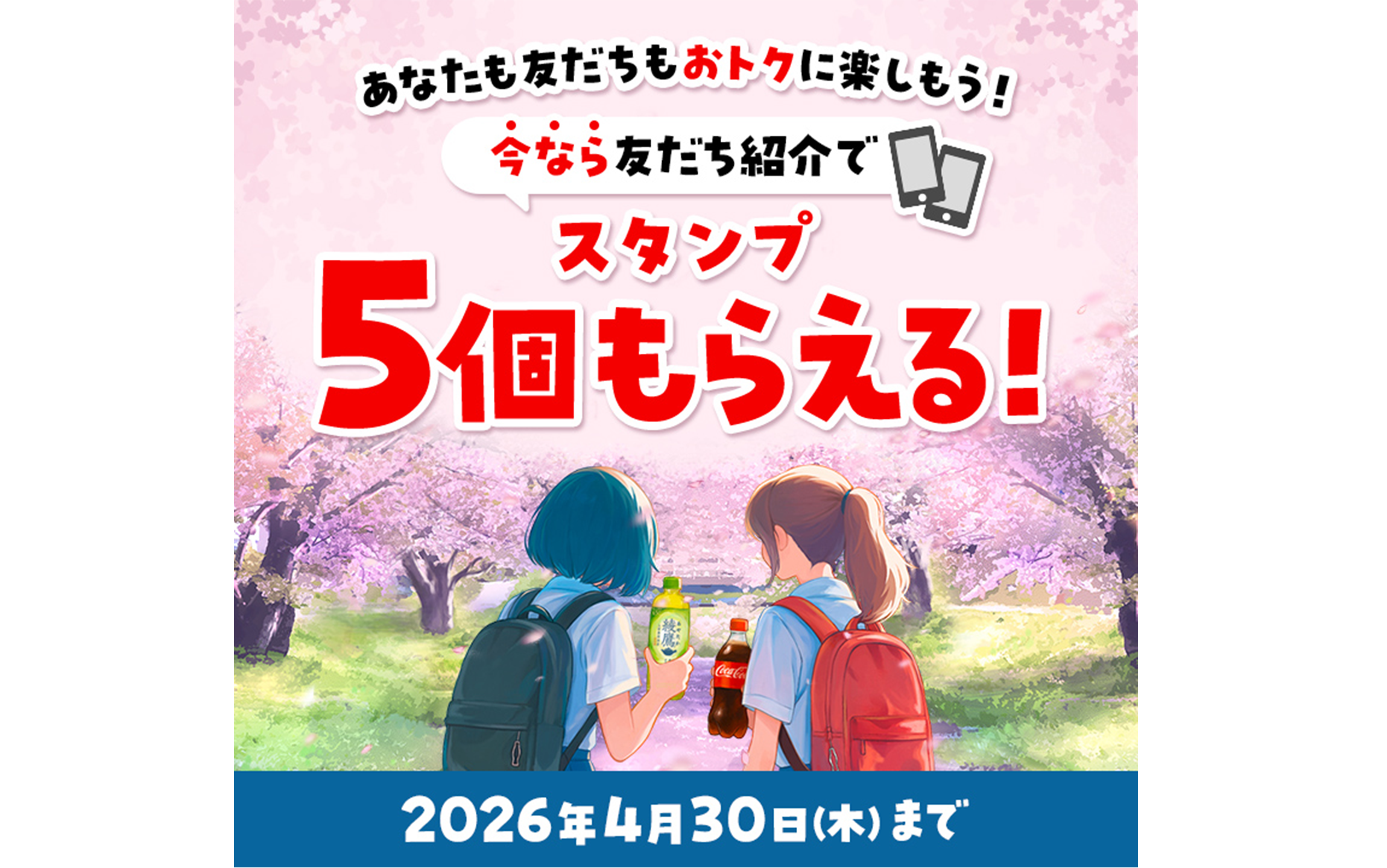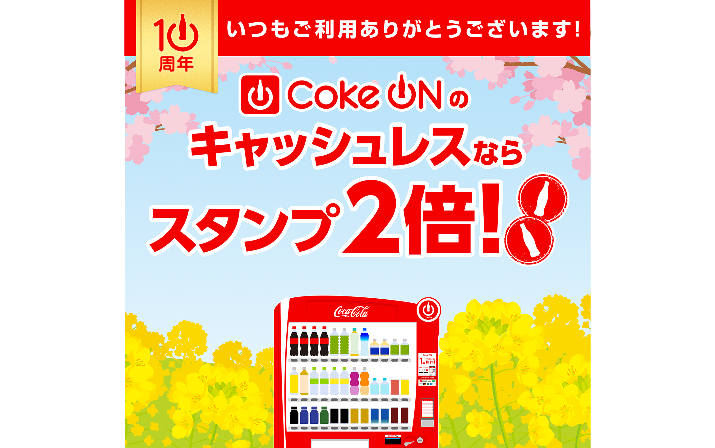 また、日ごろ「Coke ON」アプリをご愛用いただいている皆さまへ感謝を込めた企画を開催。3月1日(日)から4月30日(木)までのキャンペーン期間中に購入いただいた方全員に、10周年記念スタンプを贈呈します。あわせて、友だち紹介の特典として付与するスタンプ数を、通常3つから5つに増量します。