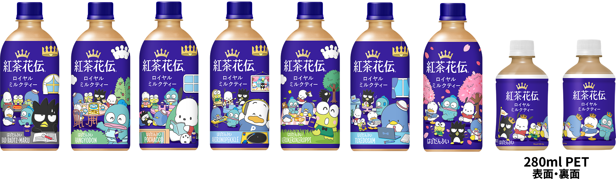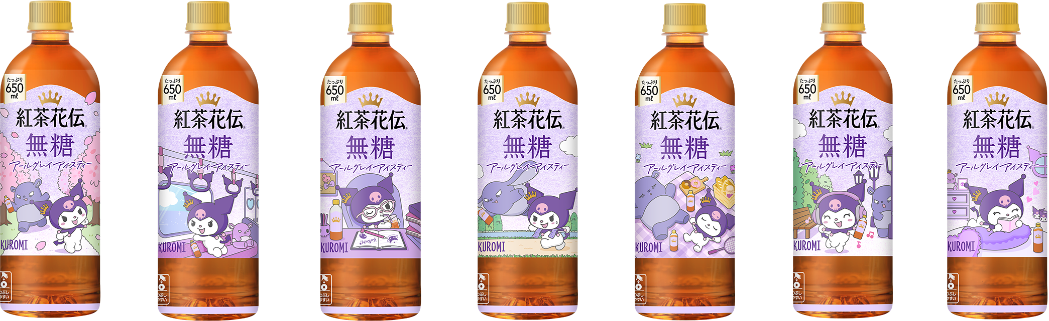 3月2日(月)に発売される限定コラボボトルは、昨年3月に新発売した、爽やかな香りと後味でごくごく飲める味わいでご好評いただいている「紅茶花伝 無糖 アールグレイアイスティー」や、同日に発売となる新フルーツティー「紅茶花伝 厳選しぼりのピーチティー」、「紅茶花伝 厳選しぼりのアップルティー」のほか、「紅茶花伝 ロイヤルミルクティー」、沖縄エリア限定「紅茶花伝 ガーデン」シリーズも含む計6製品で展開。全31種類にもわたる、「サンリオキャラクターズ」が「紅茶花伝」を楽しむシーンを描いた唯一無二のコラボボトルが登場します。