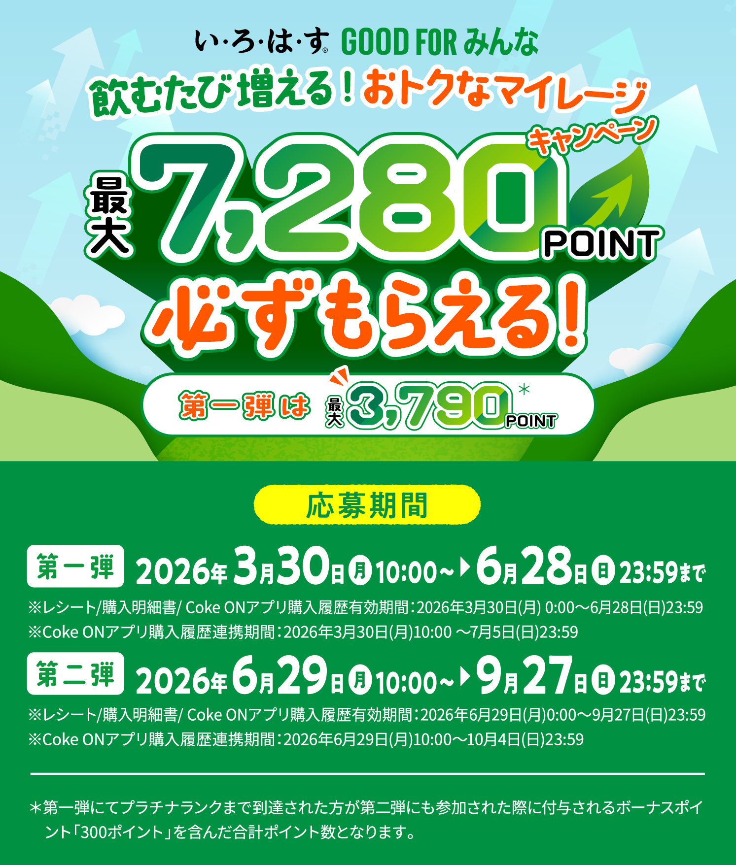 「い・ろ・は・す」は2026年より新しいブランドメッセージ「GOOD FOR みんな」を掲げ、新たなコミュニケーションを展開します。その一環として、対象製品の購入本数に応じてデジタルポイントが貯まる「い・ろ・は・す マイレージ」キャンペーンを、3月30日(月)から実施します。