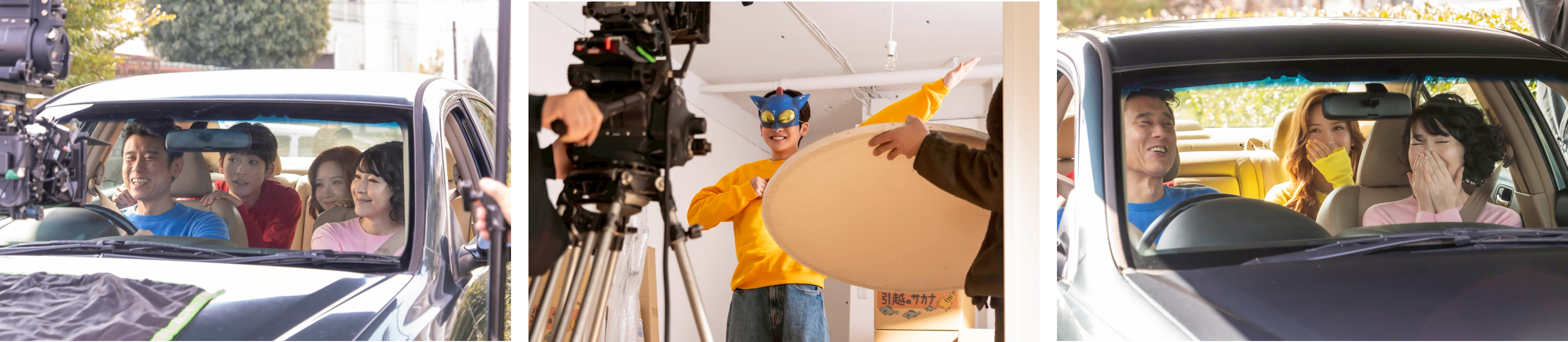 一方、しんのすけの帰りを待ちきれずに、家まで迎えに来た野原一家の車内シーンでは、本番以外の時間も近況報告で大盛り上がり。野原家らしい温かさとにぎやかさに包まれながら撮影は終了しました。