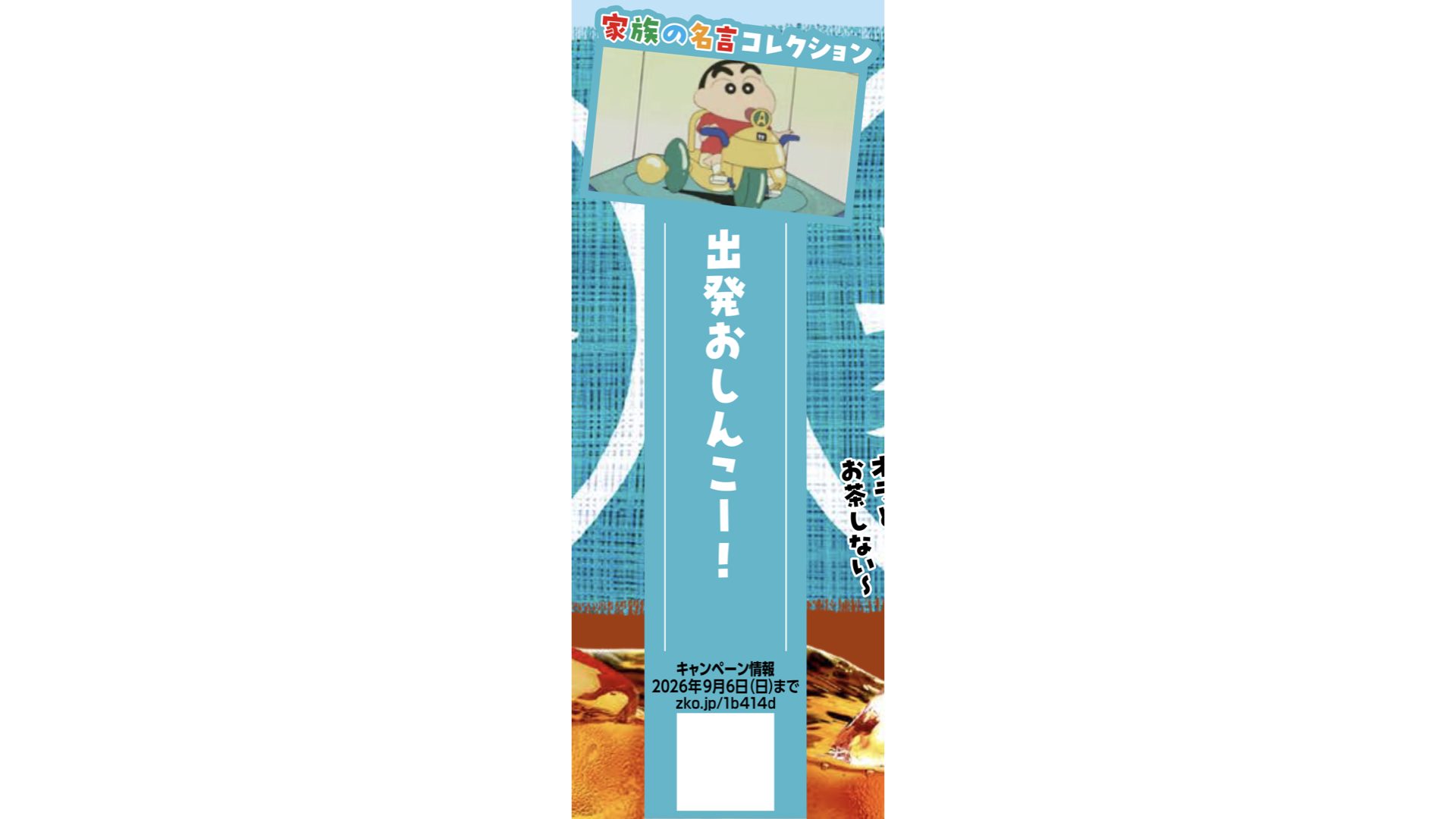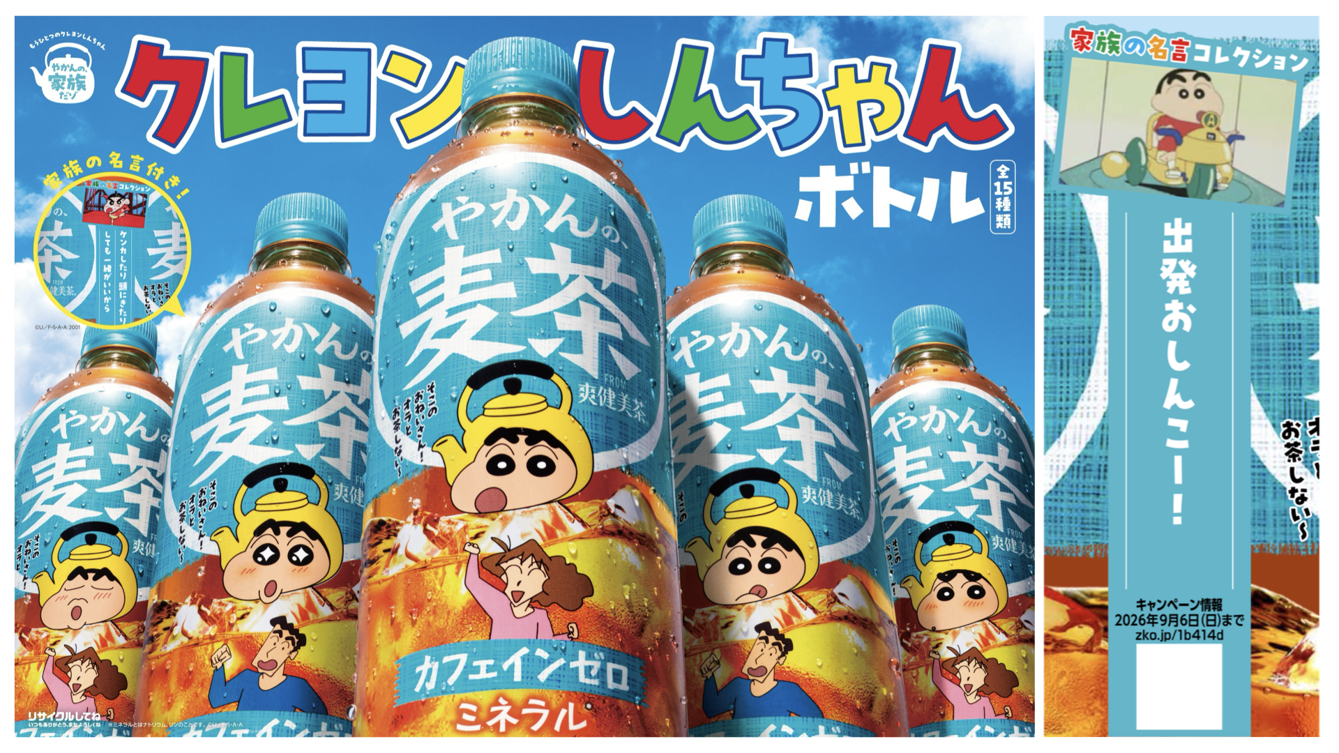 やかんをかぶったしんちゃんの限定イラストと「映画 クレヨンしんちゃん」の名シーン、名言がボトル側面にあしらわれた「家族の名言付き!クレヨンしんちゃんボトル」(通称:クレヨンしんちゃんボトル)が全15種で新登場。“めんどうだけど、愛おしい家族”をより身近に感じていただける「クレヨンしんちゃんボトル」をショートムービーと合わせてぜひお楽しみください。