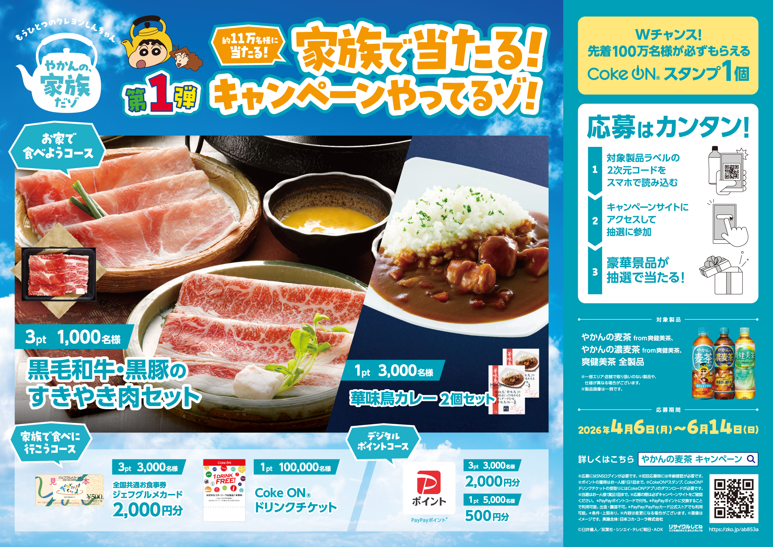期間中、対象製品を購入し、ラベルのQRコードをスマートフォンから読み込みアクセスして応募すると抽選で、家族で食べに行ける「ジェフグルメカード」や、家族とおうちで楽しめる「黒毛和牛・黒豚のすきやき肉セット」がもらえるキャンペーンを実施します。また、先着100万名様にCoke ONスタンプ1個をプレゼントします。