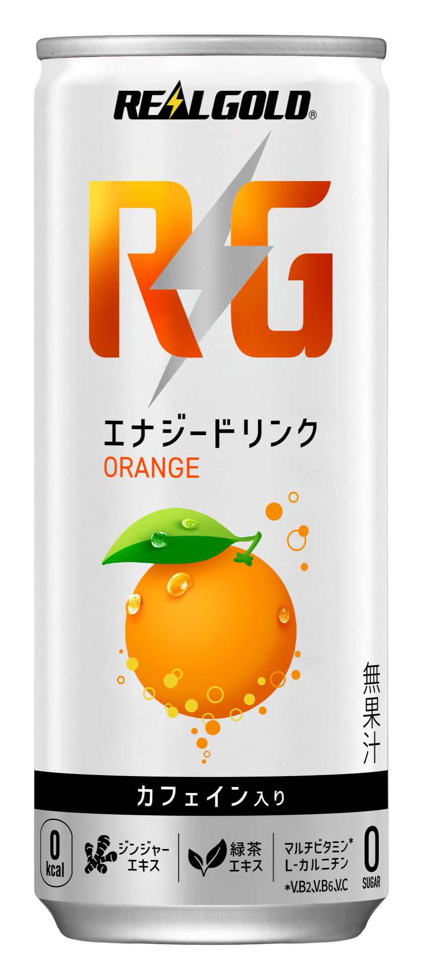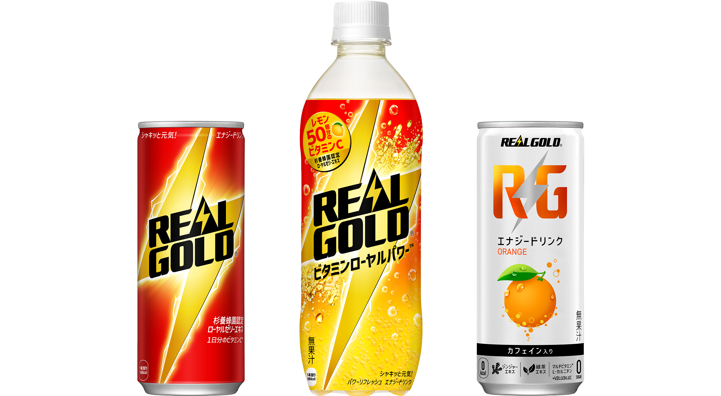 (左より)「リアルゴールド」250ml缶 「リアルゴールド ビタミンローヤルパワー」 490mlPET 「リアルゴールド RG オレンジ」250ml缶