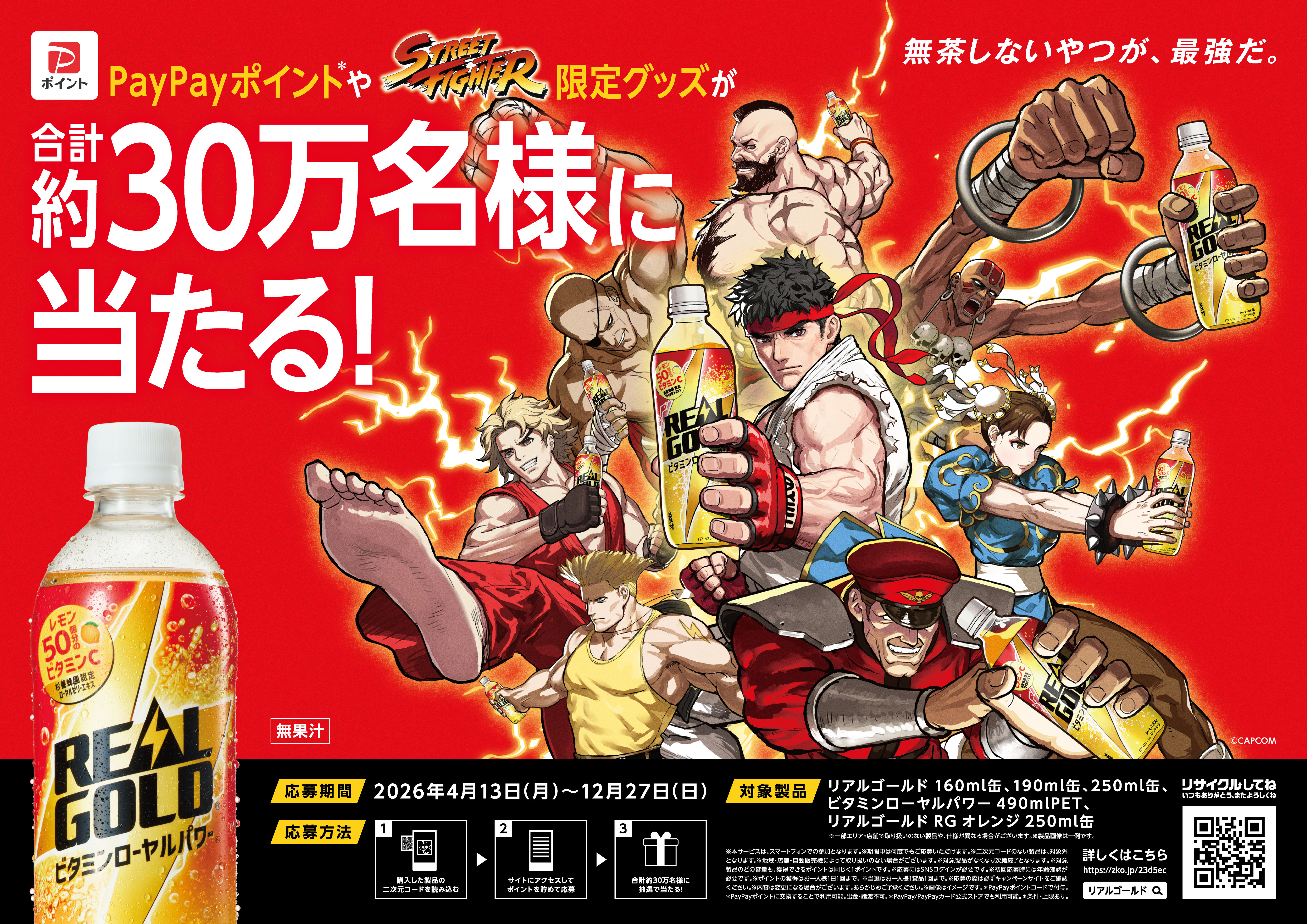期間中、対象製品を購入してラベルに記載の二次元コードをスマートフォンで読み込み、キャンペーンサイトにアクセスするとポイントが貯まります。貯めたポイントで応募すると、『ストリートファイター』限定コラボグッズやPayPayポイント100ptが抽選で当たります。詳細は、キャンペーンサイトをご覧ください。