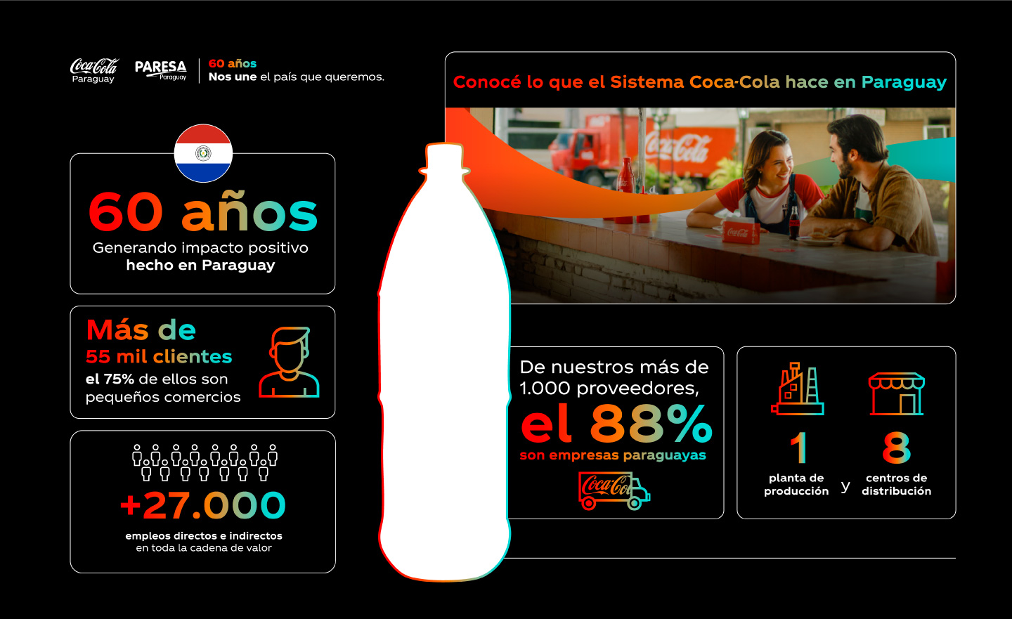Detrás de tu bebida favorita, hay un impacto positivo hecho en Paraguay que hemos construido juntos en seis décadas en el país. Generando miles de puestos de trabajo directos e indirectos, modernizado permanentemente nuestras instalaciones y procesos industriales, e impulsado cadenas de valor que benefician a proveedores, distribuidores y comunidades en todo el territorio nacional.